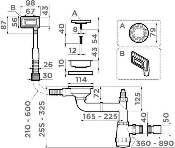 - Арматура для одночашевых моек с универсальным прямоугольным переливом.