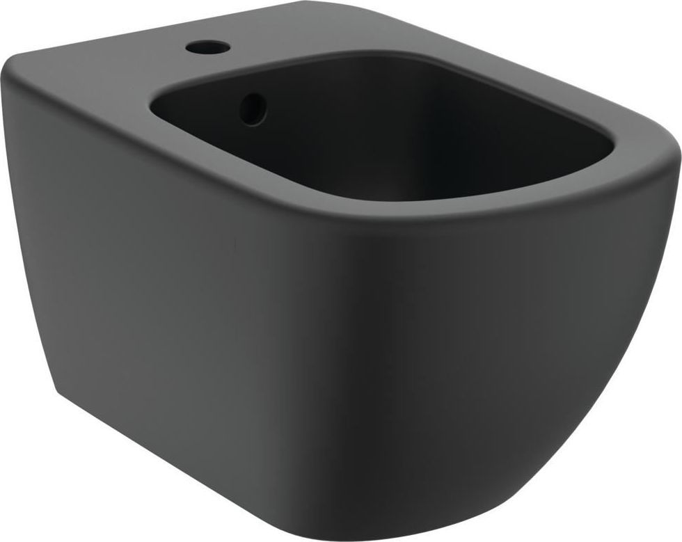 Биде подвесное Ideal Standard Silk Black Tesi T3552V3, с отверстием под смеситель, с отверстием перелива, с крепежом TT0299598 для полностью скрытого монтажа, цвет черный матовый.