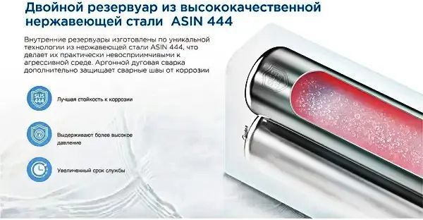 - Внутренний резервуар изготовлен по уникальной технологии из нержавеющей стали ASIN 444, что делает его практически невосприимчивыми к агрессивной среде.