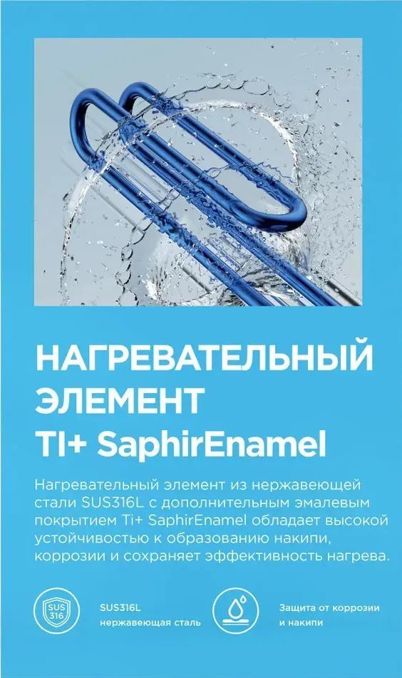 - Высокопроизводительный нагревательный элемент (ТЭН), из нержавеющей стали с дополнительным защитным эмалированным покрытием Ti+ - аналог сухого тэна, только греет воду также быстро, как и мокрый тэн и до 75 градусов.