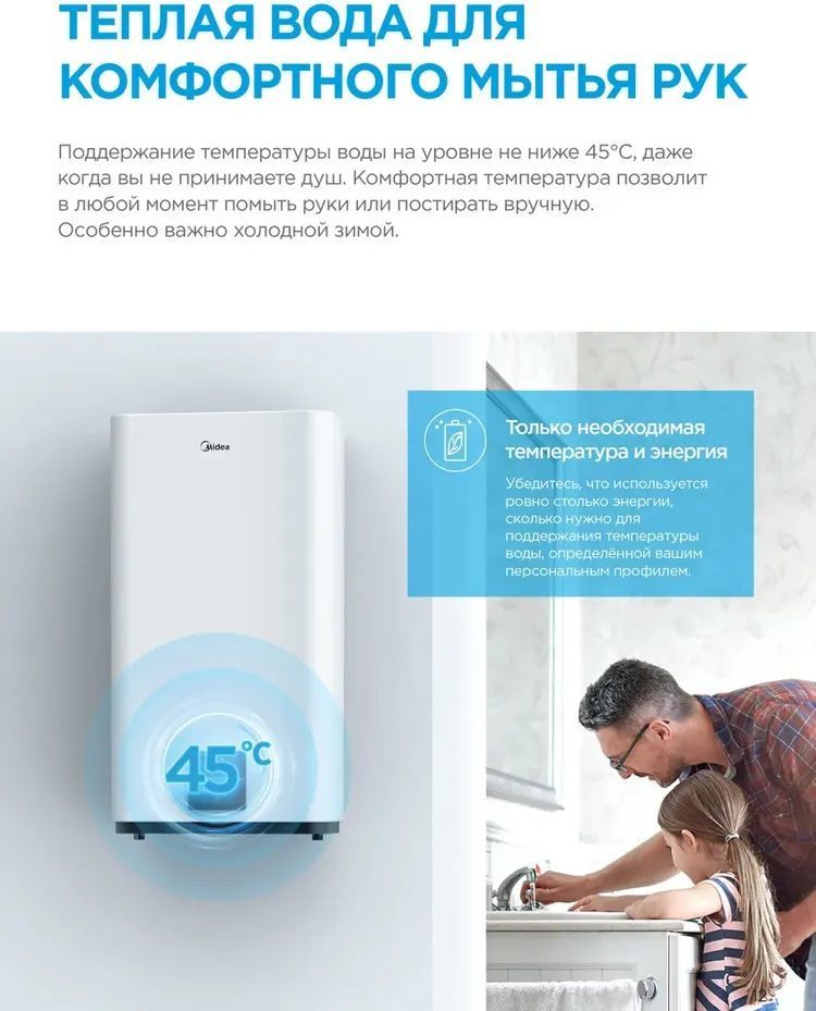 Midea серии Flex MWH-5020-DUM представляет собой надежный и безопасный в эксплуатации электрический накопительный водонагреватель, плоской формы, что позволит сэкономить пространство и универсальным монтажом (вертикально/горизонтально), с внутренним покрытием бака из высококачественной нержавеющей стали, который позволит Вам на долгие годы решить проблему горячего водоснабжения в доме или квартире, имеет реверсивную панель управления (можно поменять положение при горизонтальном монтаже), с помощью которой Вы сможете управлять мощностью нагревательного элемента и регулировать температуру нагрева воды.