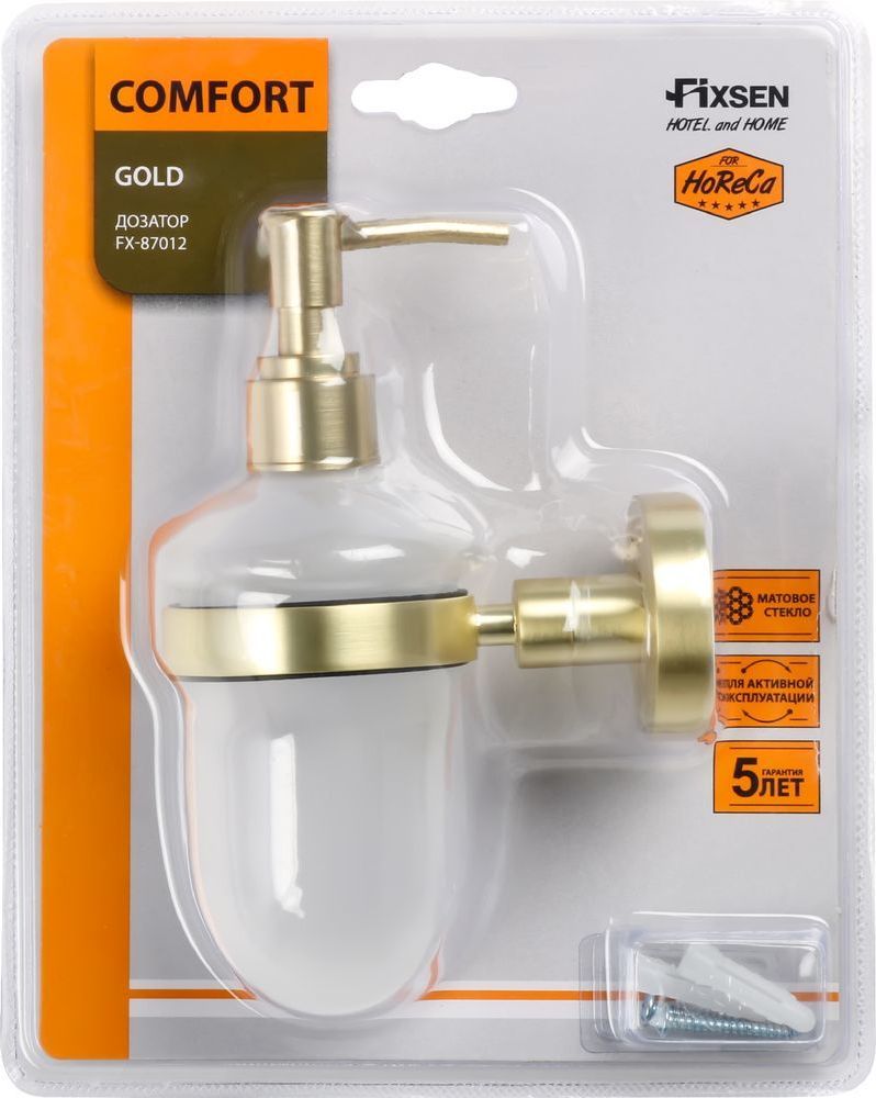 Дозатор для жидкого мыла Fixsen Comfort с настенным держателем, материал сталь, цвет золото-сатин.