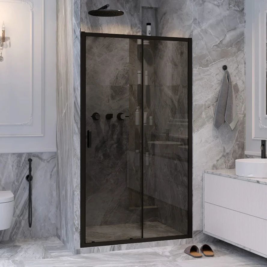 Душевая дверь Ambassador Forsa, размер 1200х2000 мм, профиль чёрный, стекло тонированное 6 мм. Габариты регулировки (1185x1200)x2000 мм, ширина входа 480 мм. Поддон приобретается отдельно.
