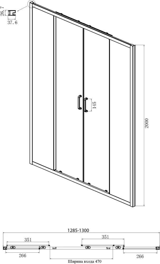 Душевая дверь Ambassador Forsa, размер 1300х2000 мм, профиль хром, стекло прозрачное 6 мм. Габариты регулировки (1285x1300)x2000 мм, ширина входа 470 мм. Поддон приобретается отдельно.