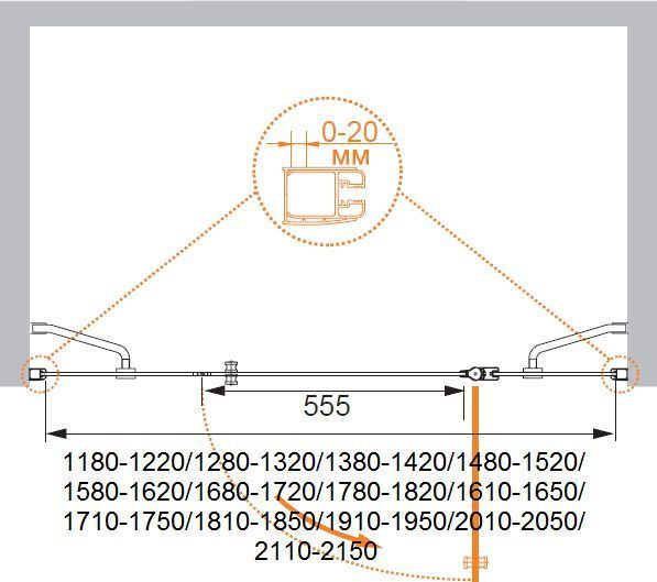 Душевая дверь Cezares ELENA-W-B-13-100+60/30-C-Cr, размер 1850х1950 мм, профиль хром, стекло прозрачное, габариты регулировки (1810-1850)х1950 мм, вход 555 мм. Поддон приобретается отдельно.