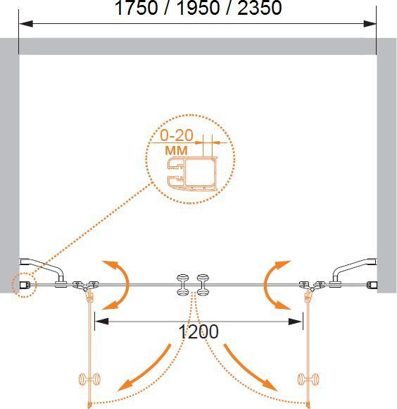 Душевая дверь Cezares ELENA-W-B-22-200-C-Cr, размер 1950х1950 мм, профиль хром, стекло прозрачное, габариты регулировки (1914-1954)х1950 мм, вход 1200 мм. Поддон приобретается отдельно.