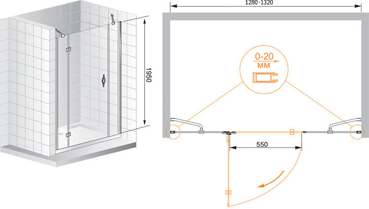 - размер двери 60 см, размер неподвижных стенок 30/40 см.
