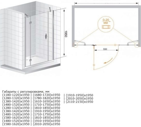 - размер двери 60 см, размер неподвижных стенок 40/60 см.