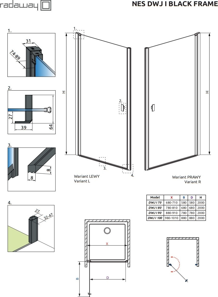 Душевая дверь Radaway Nes Black DWJ I Frame 700х2000 мм, стекло - Frame (прозрачное с черным кантом 6 мм), профиль - черный. Душевой поддон приобретается отдельно.