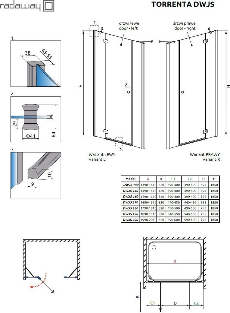 Душевая дверь Radaway Torrenta DWJS 1400*1850 мм, распашная дверь, стекло - прозрачное, профиль - хром. Дверь доступна в правом и левом вариантах (на фото левый вариант).