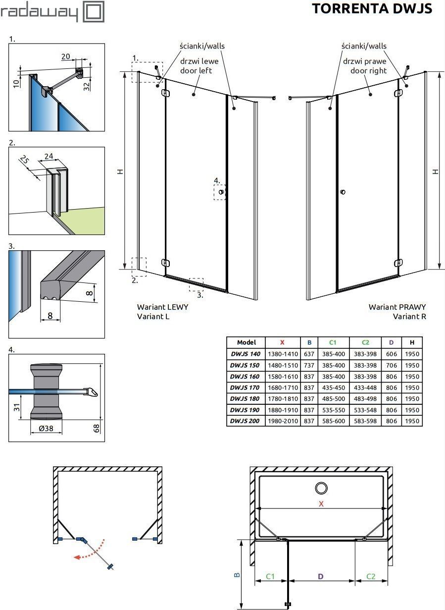 Душевая дверь Radaway Torrenta DWJS 1900x1950 мм, состоящая из распашной двери 812 L и комплекта неподвижных стенок 520, стекло - прозрачное 6 мм, профиль - хром. Размеры с диапазоном регулировок: 1880-1910 мм. Ширина входа: 806 мм. Поддон приобретается отдельно.