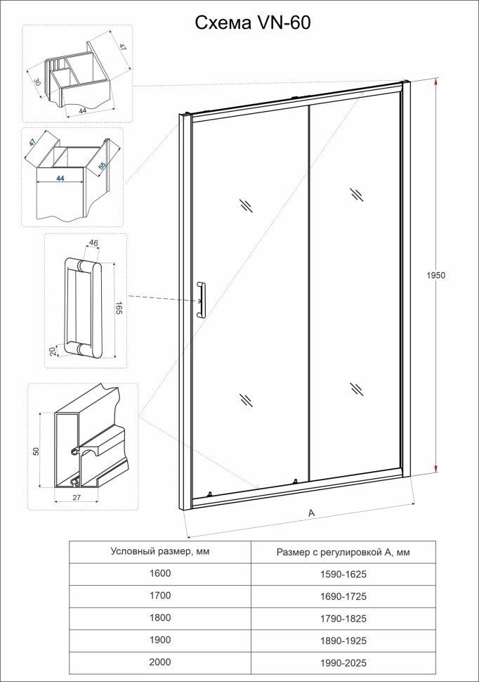 Душевая дверь Veconi Vianno VN60-200-01-C5, размер 200х195 см, профиль хром, стекло прозрачное, вход 890 мм. Габариты регулировки (1990-2025)х1950 мм.