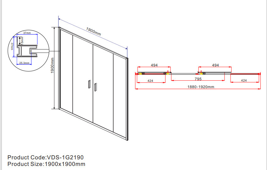 Душевая дверь Vincea Garda 1900х1900 мм, стекло - прозрачное 6 мм, профиль - хром, ширина входа - 795 мм, габариты с диапазоном регулировок: 1880-1920 мм, поддон приобретается отдельно.
