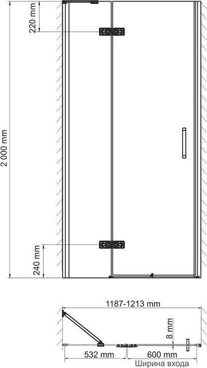 Душевая дверь WasserKraft Aller 10H05LBLACK MATT 1200х2000 мм. Цвет профиля – хром, цвет стекла – прозрачное, 8 мм. Габариты с регулировками 1187-1213 мм. Ширина входа 600 мм. Душевой поддон приобретается отдельно.