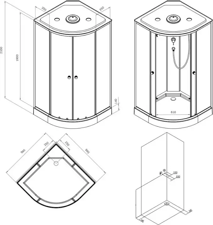 - угловая конструкция душевой кабины с размером 1000x1000 мм - комфортное пространство для принятия душа.