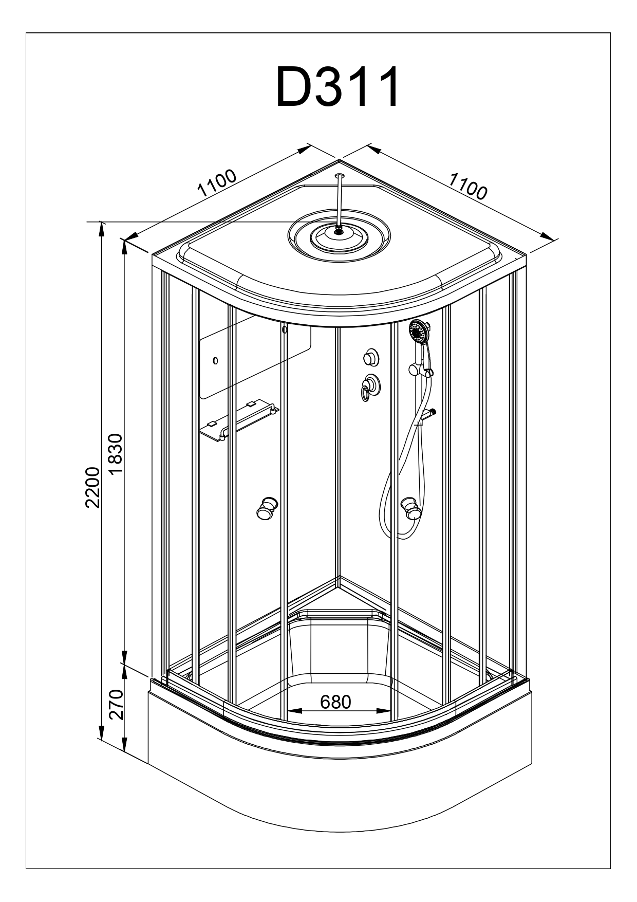 Стильная душевая кабина с внутреннй сборкой AvaCan D311S с электрикой сочетает в себе высокую функциональность, практичность и надежность. Для изготовления применяют безопасное закаленное стекло толщиной 4 мм, надежно фиксируемое алюминиевым профилем. Цвет профиля хром. В комплекте сифон, полочка, зеркало, сенсорный пульт управления, смеситель, переключатель режимов, душевой гарнитур, тропический (верхний) душ, вентиляция, радио.