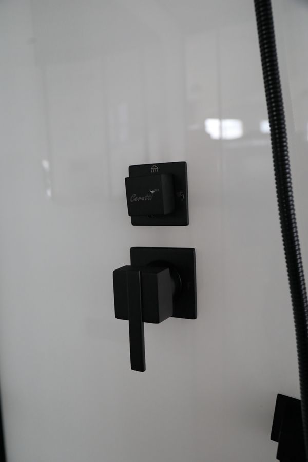 Стильная, просторная душевая кабина с верхним тропическим и ручным душем, с большим зеркалом и полочкой. Задние стенки из белого закаленного стекла.