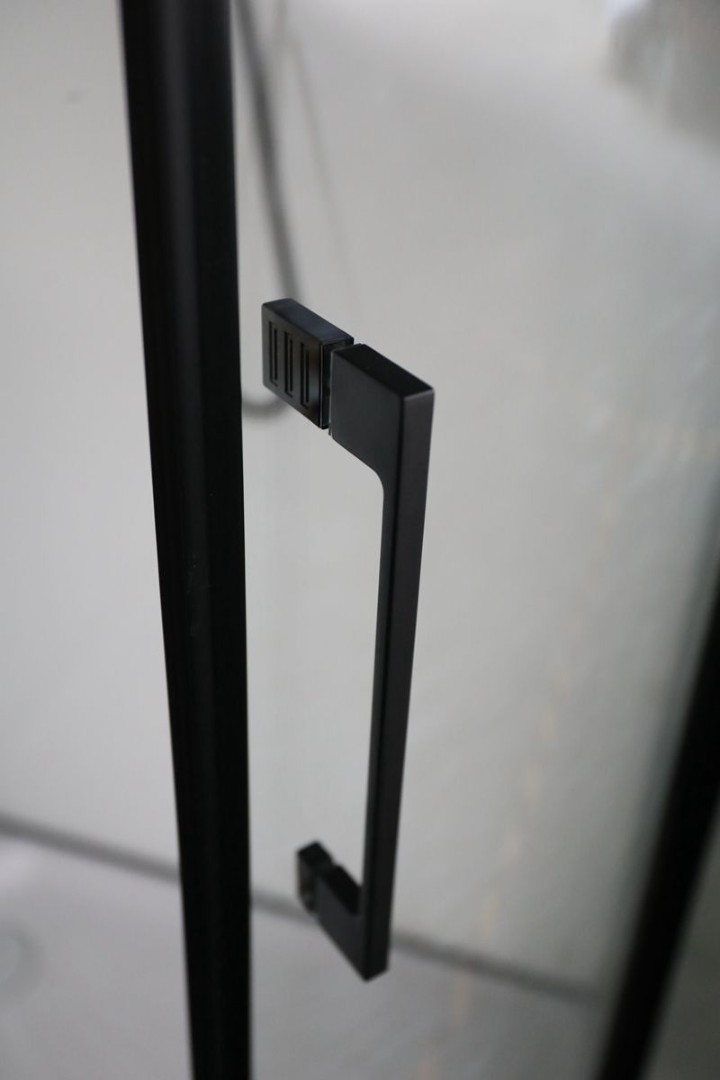 - Стильная со стеклянными задними стенками и черным профилем подчеркнет интерьер Вашей ванной комнаты.