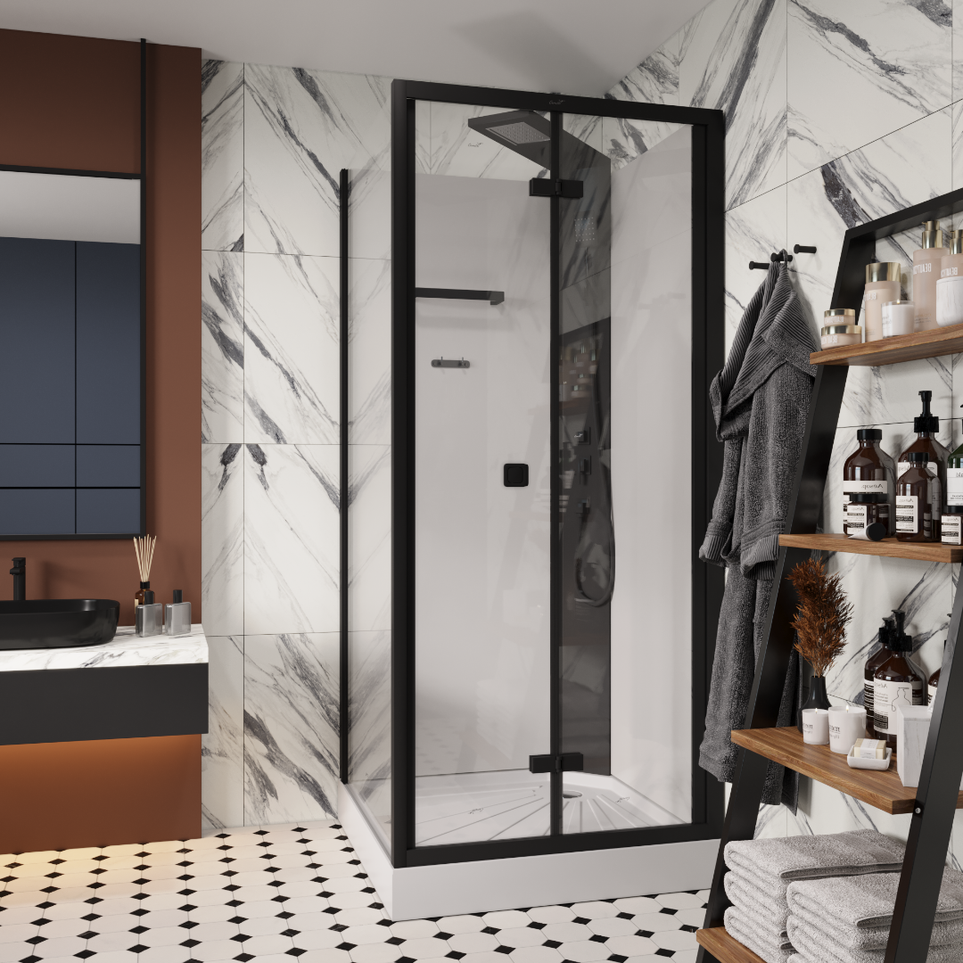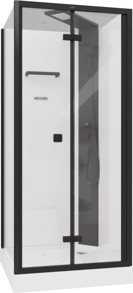 Стильная душевая кабина оборудованная о последнему слову техники большим тропическим душем, складной дверью и низким квадратным поддоном, черным строгим профилем. Только правосторонняя сборка (дверь справа!).
