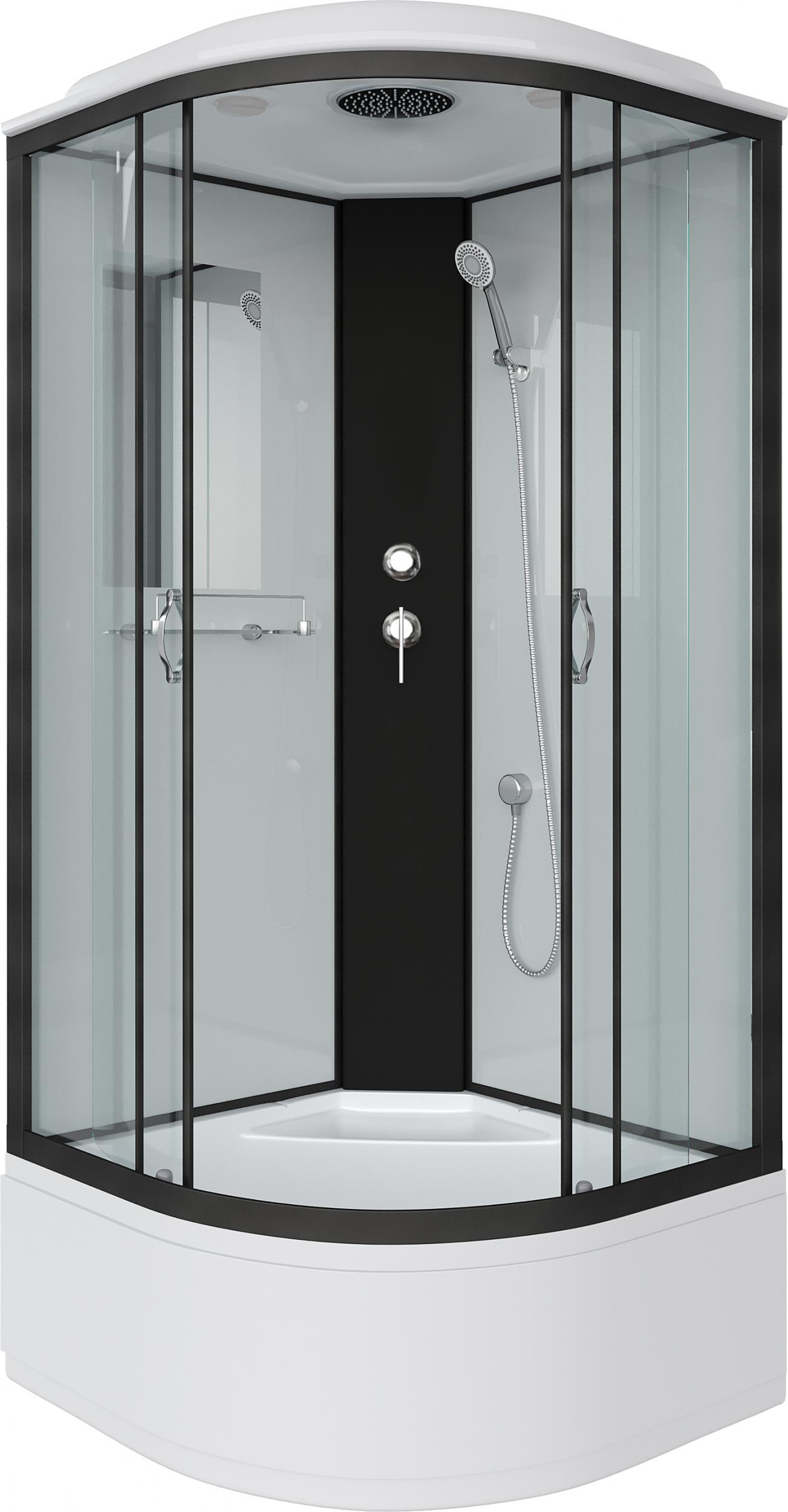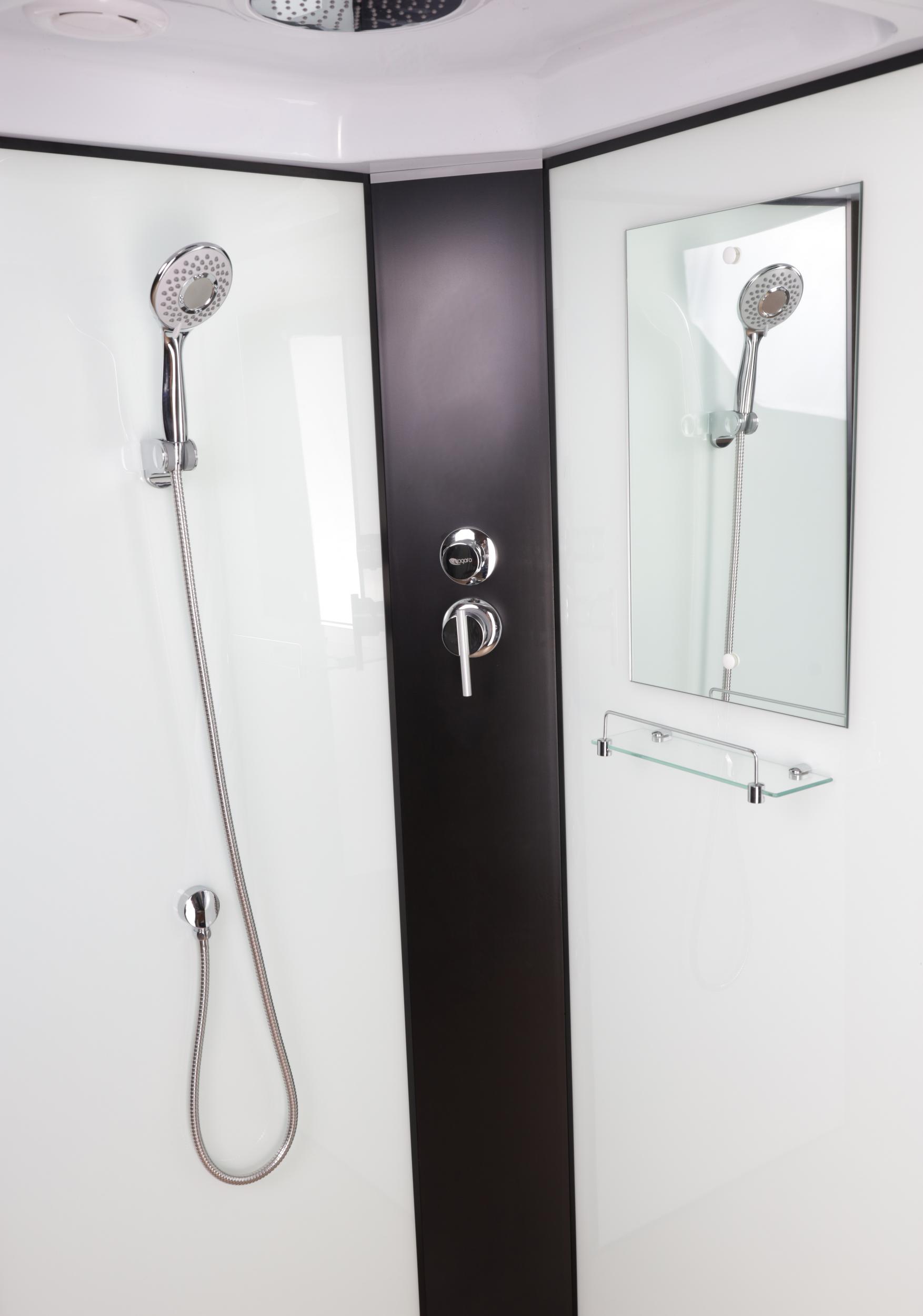 - Профиль выполнен в черном варианте, стенки и двери кабины - белые матовые. Центральная панель пластиковая черного цвета, на ней установлен смеситель с переключателем режимов.