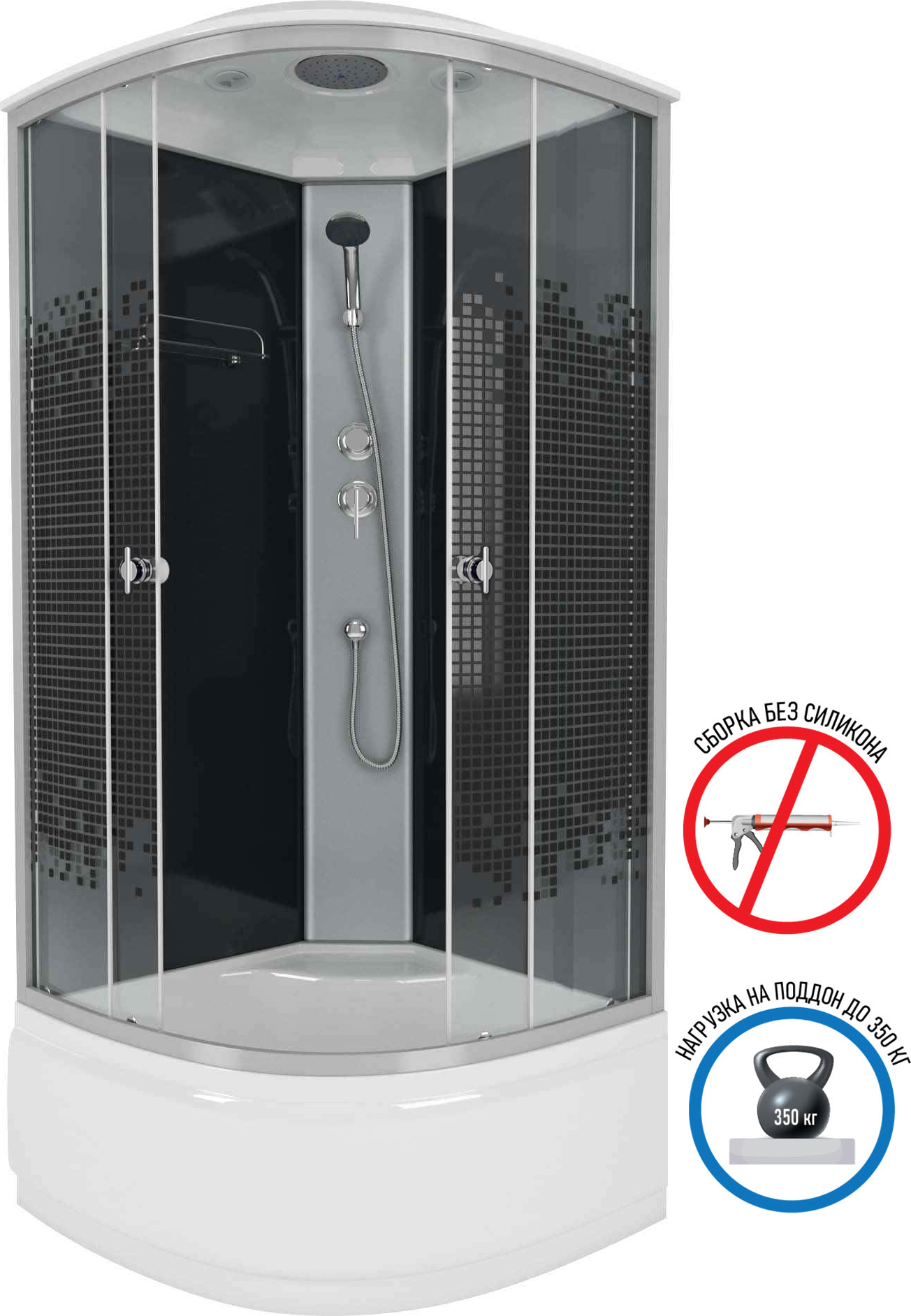 - Размер кабины 80x80x215 см, стенки тонированные с рисунком Мозаика.