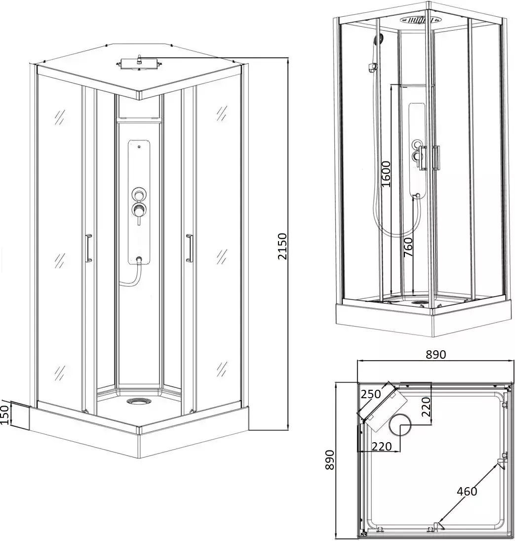 - Верхний душ из нержавеющей стали в цвет профиля.