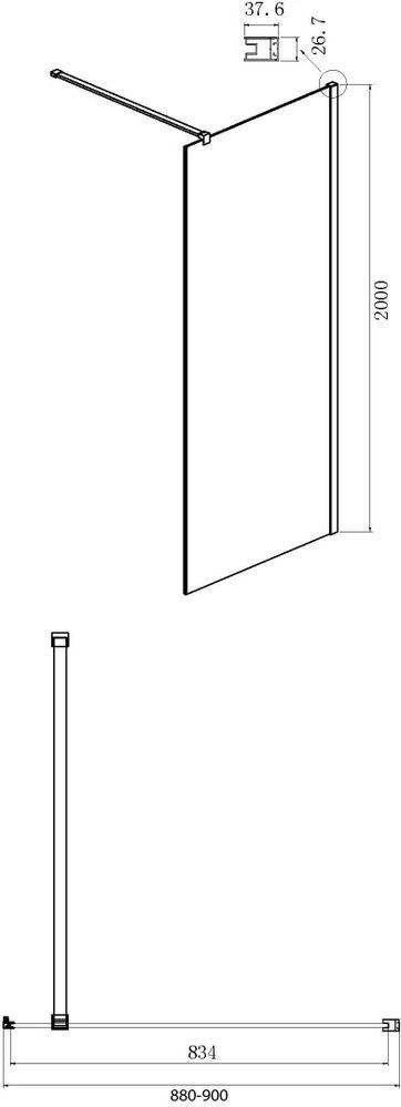 Душевая перегородка Ambassador Elysium с кронштейном, размер 900х2000 мм, профиль хром, стекло прозрачное. Габариты регулировки (880-900)x2000 мм.