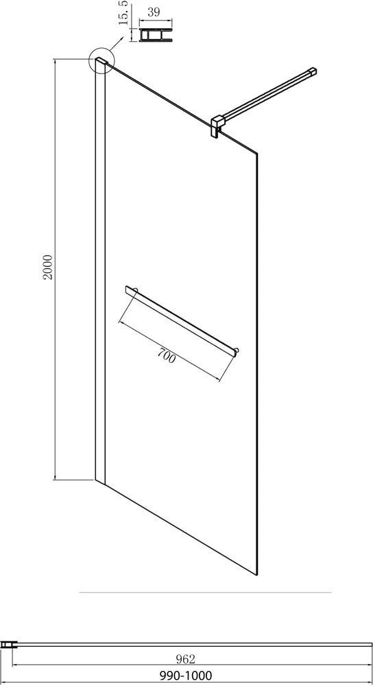 Душевая перегородка Ambassador Walk-in с кронштейном, размер 1000х2000 мм, профиль хром, стекло прозрачное. Габариты регулировки (990-1000)х2000 мм, ширина входа 1000 мм.