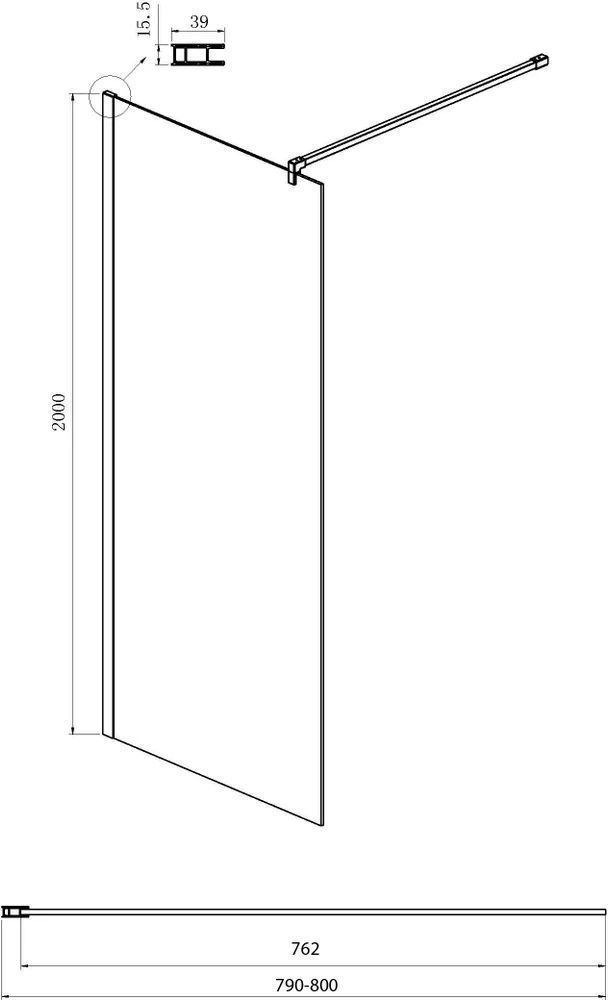 Душевая перегородка Ambassador Walk-in с кронштейном, размер 800х2000 мм, профиль чёрный, стекло зеркальное. Габариты регулировки (790-800)х2000 мм, ширина входа 1000 мм.