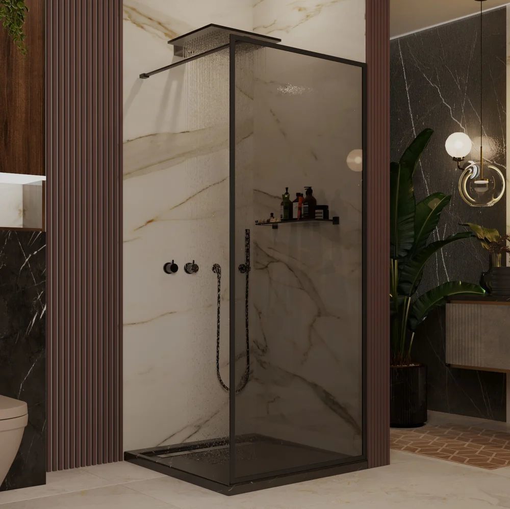 Душевая перегородка Ambassador Walk-in с кронштейном, размер 895х2000 мм, профиль чёрный, стекло тонированное. Ширина входа 1000 мм.