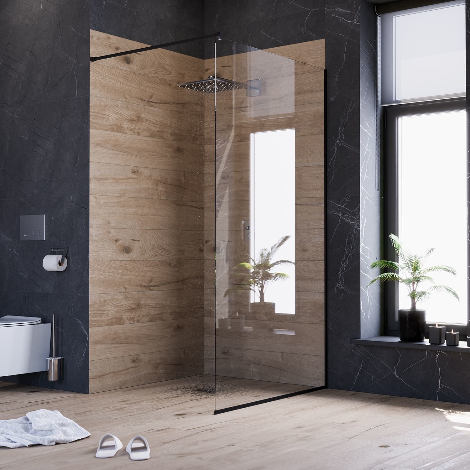 Душевая перегородка Mirsant Walk in с аксессуарами, профиль чёрный, стекло прозрачное.