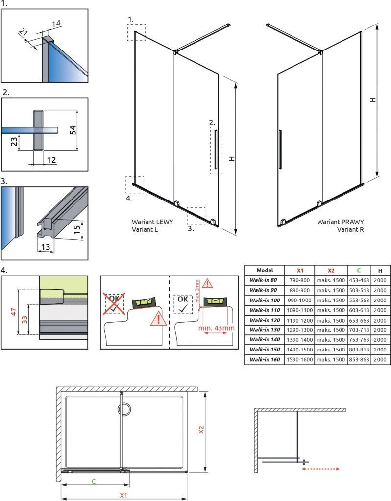 - Стекло крепится к стене с помощью пристенных профилей (с регулировкой)