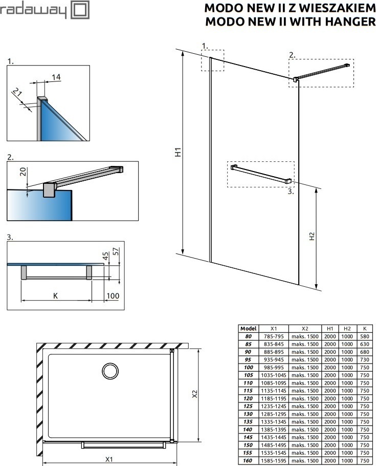 Душевая перегородка Radaway Modo New II 800х2000 мм с полотенцедержателем. Цвет профиля – хром, цвет стекла – прозрачное, 8 мм.