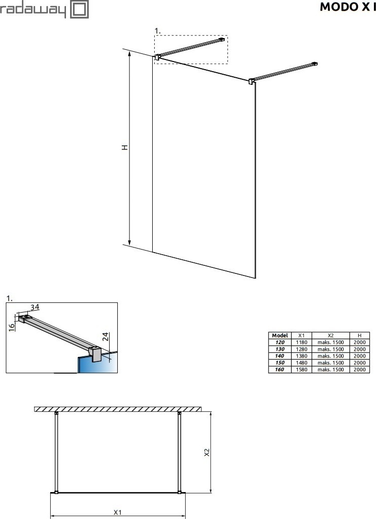 Душевая перегородка Radaway Modo X Black I 1200х2000 мм. Цвет профиля – черный, цвет стекла – прозрачное, 10 мм.