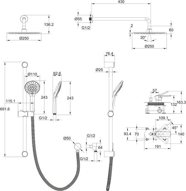 - Комплектация: душевой набор (тропический душ, душевая лейка, подставка для душа, душевой шланг)