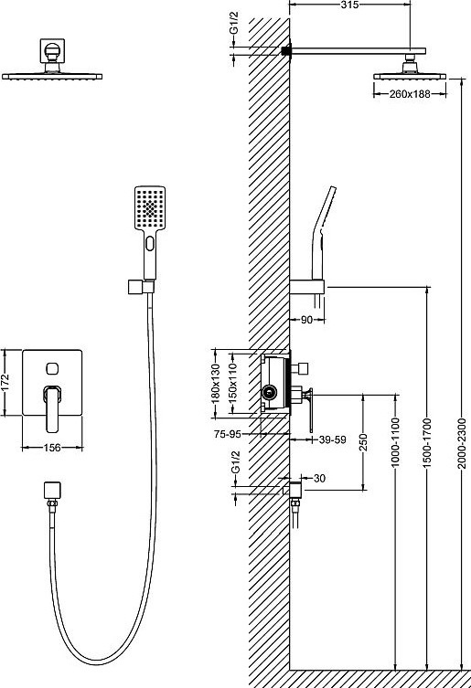 - Размер верхнего душа: 260 x 188 мм