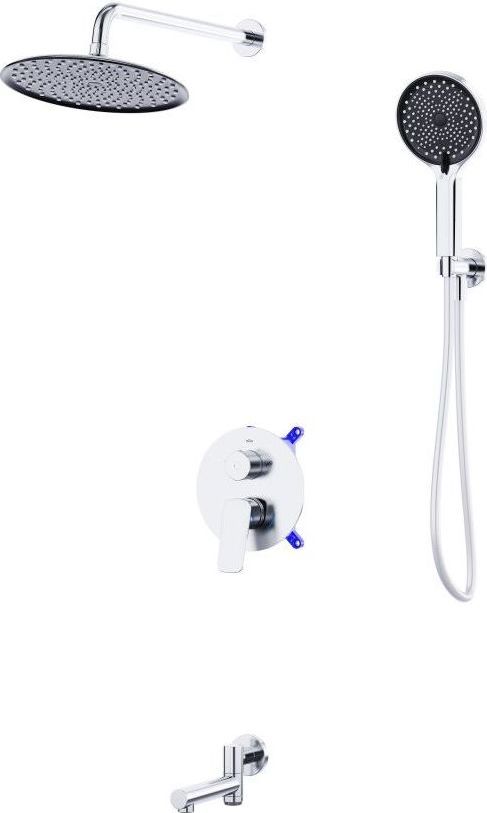 - Оснащение: встраиваемый смеситель с переключателем на два выхода, верхний душ с кронштейном, излив для ванны, ручной душ 3-х режимный со шлангом, штуцером и держателем