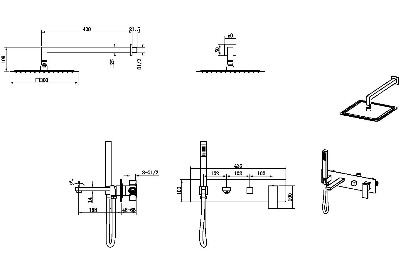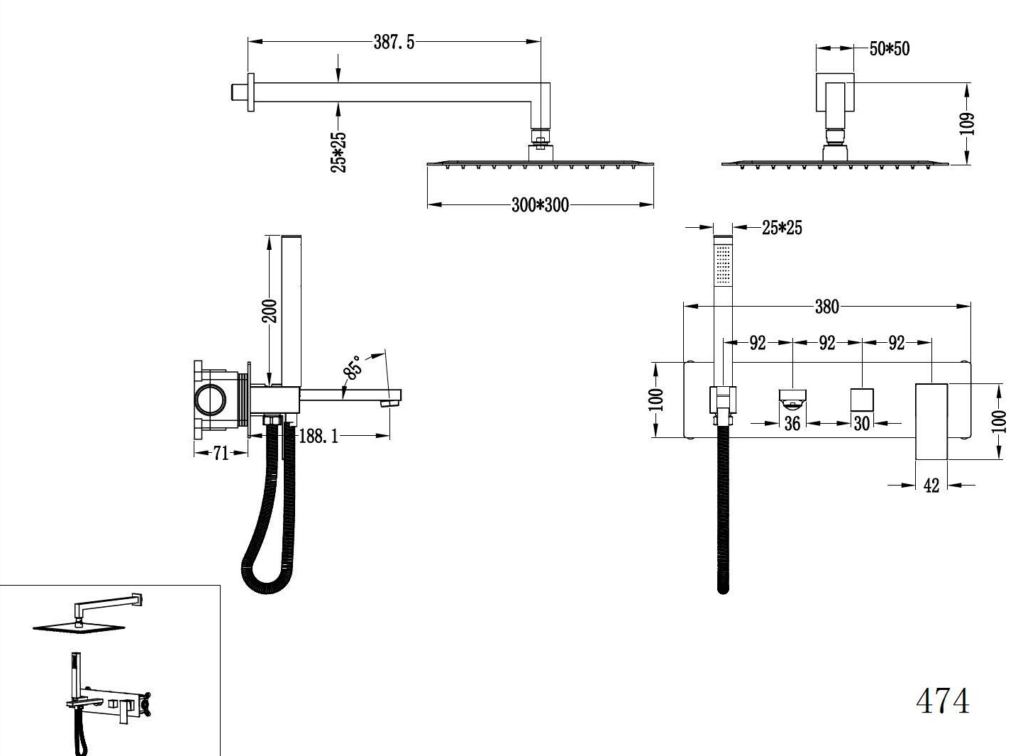 Душевая система для ванны Boheme Qubic 474-BRB, скрытая часть в комплекте, материал латунь, цвет брашированная бронза.