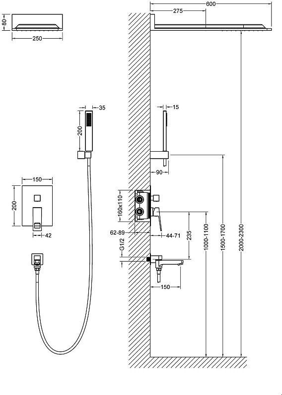 - Размер верхнего душа: 502 x 230 мм
