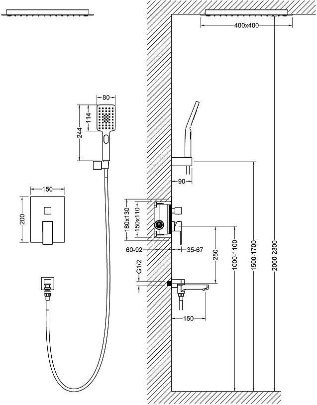 - Размер верхнего душа: 400 x 400 мм