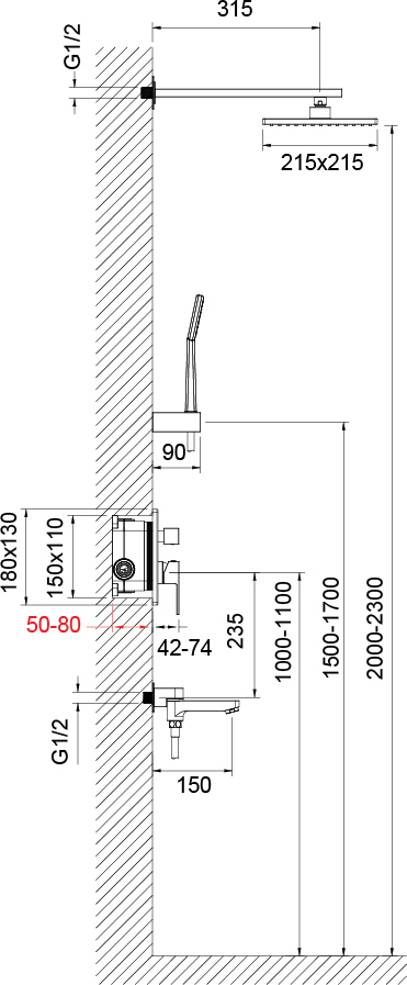 - Размер верхнего душа: 200 x 200 мм