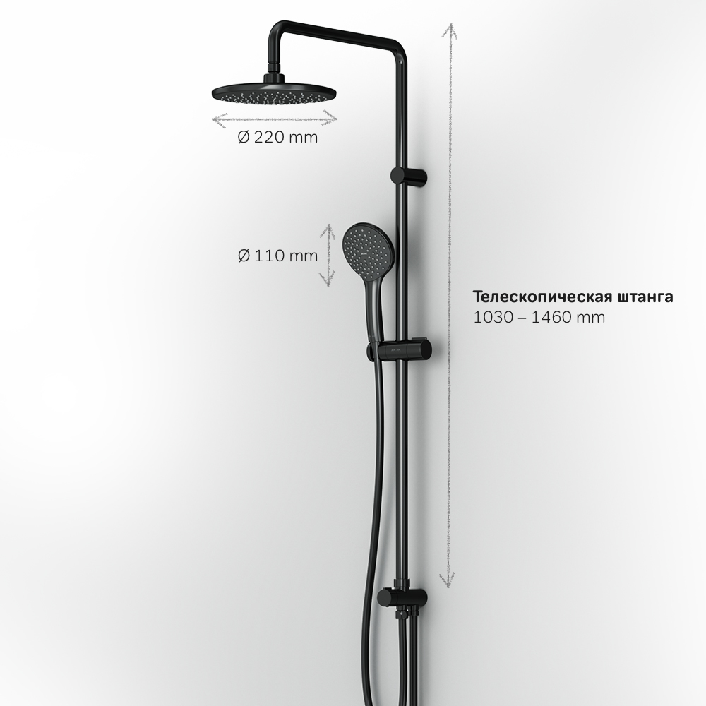 Тотальный дизайн в действии: все детали душевой системы – от пропорций ручного и верхнего душей до рисунка расположения форсунок на лейках – подчинены единой дизайн-концепции коллекции Gem. Интенсивный напор даже при низком давлении в системе: инновационная функция Air In увеличивает напор вдвое при этом сокращая расход воды на 30%. Результат – экономия средств забота об экологии а главное – непередаваемое удовольствие от принятия душа. Диаметр душевых леек (верхний душ 220 мм и ручной душ 110 мм) позволит ощутить преимущества тропического душа даже в стандартной ванной тогда как увеличенная длина шланга 1750 мм обеспечит свободу движений во время принятия душа. Продуманные детали для удобства использования: телескопическая поворотная штанга регулируется по высоте в диапазоне от 1030 до 1460 мм обеспечивая комфорт для людей любого роста.