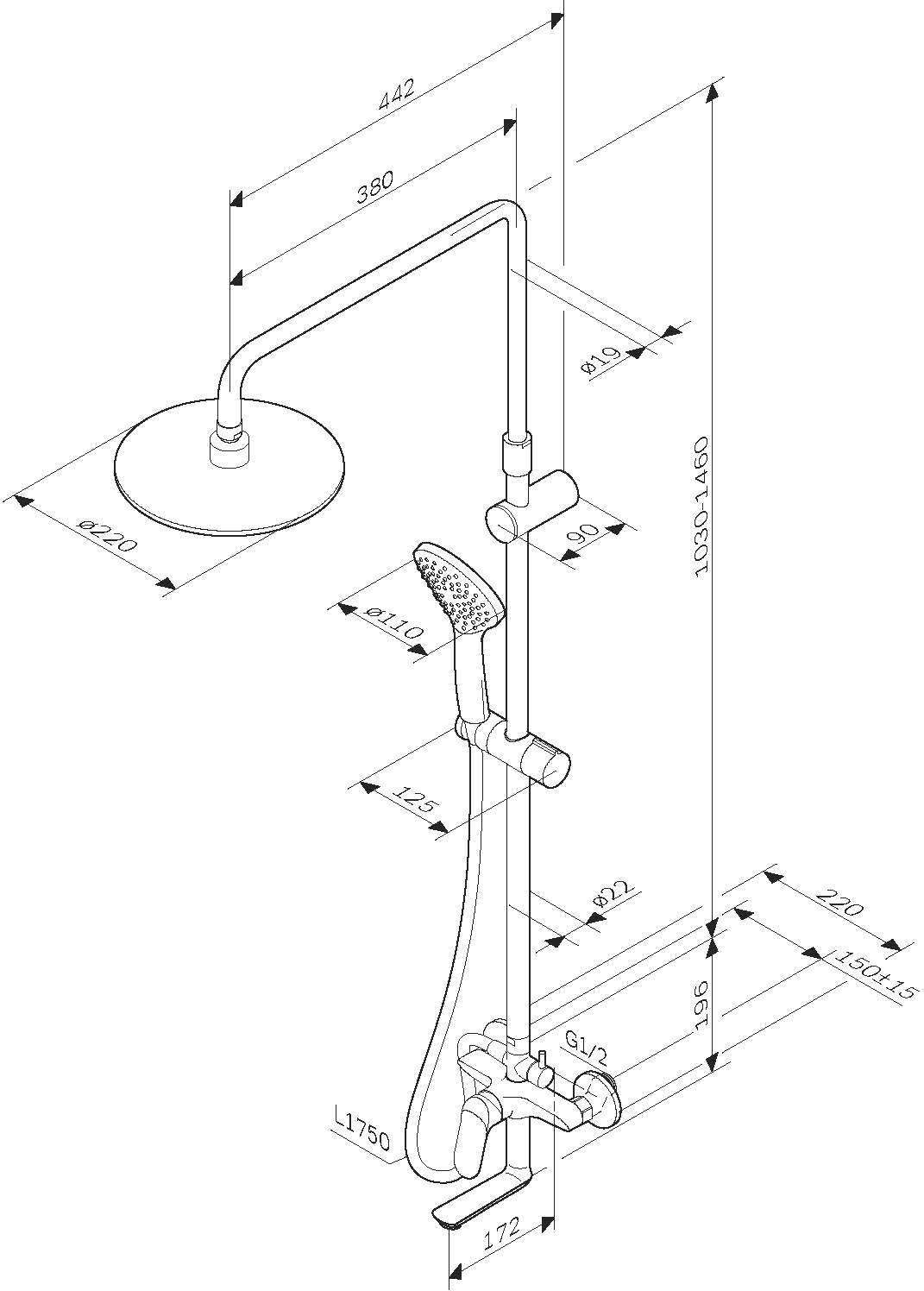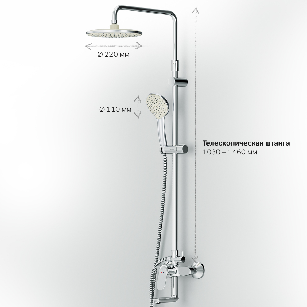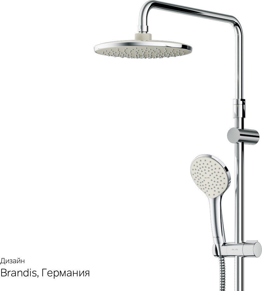 Тотальный дизайн в действии: все детали душевой системы – от пропорций ручного и верхнего душей до рисунка расположения форсунок на лейках – подчинены единой дизайн-концепции коллекции Sunny. Интенсивный напор даже при низком давлении в системе: инновационная функция Air In увеличивает напор вдвое при этом сокращая расход воды на 30%. Результат – экономия средств забота об экологии а главное – непередаваемое удовольствие от принятия душа. Диаметр душевых леек (верхний душ 220 мм и ручной душ 110 мм) позволит ощутить преимущества тропического душа даже в стандартной ванной тогда как увеличенная длина шланга 1750 мм обеспечит свободу движений во время принятия душа. Продуманные детали для удобства использования: телескопическая поворотная штанга регулируется по высоте в диапазоне от 1030 до 1460 мм обеспечивая комфорт для людей любого роста.