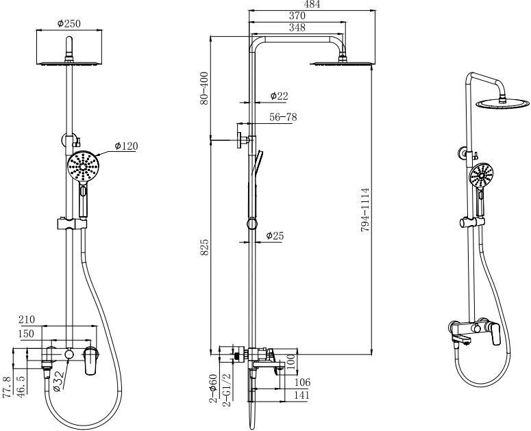 - крегулируемая душевая штанга из нержавеющей стали, выдвигающаяся до 1114 мм в высоту