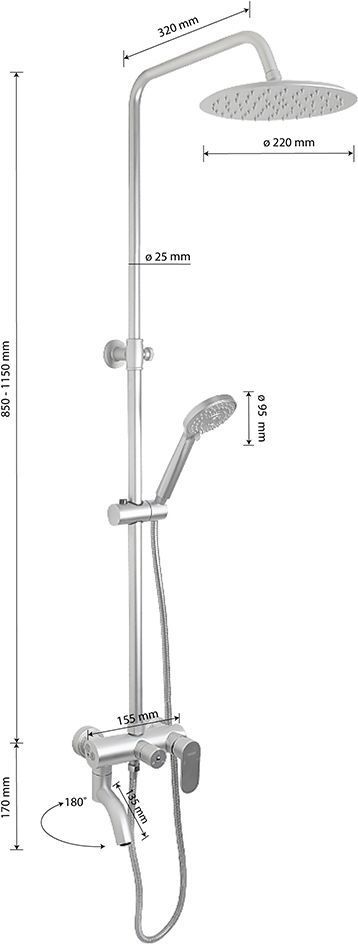 Смеситель + стойка душевая телескопическая "тропический душ" с двумя лейками в ванную / душевую комнату из авиационного алюминия, матовая. Смеситель шаровый с дивертором м/к на корпусе с коротким поворотным изливом, душевым шлангом и лейкой. Картридж d = 40 мм, ручка литая, аэратор для экономии воды, чашки и эксцентрики. Душевая, регулируемая по высоте стойка с присоединением к корпусу смесителя и дополнительным креплением к стене и большой круглой лейкой с эффектом тропического душа. Габаритные размеры: ширина смесителя 150 мм, высота 170 мм, длина излива корпуса 135 мм, длина излива стойки 320 мм, высота телескопической стойки от 850 - 1150 мм, трёхрежимная душевая лейка d = 95 мм, лейка тропический душ d = 220 мм, шланг 150 см. Вес - 3,600 кг, объём - 0,05700 м3. В комплекте корпус с изливом, чашки, эксцентрики, прокладки, стойка, шланг, две лейки, крепления.