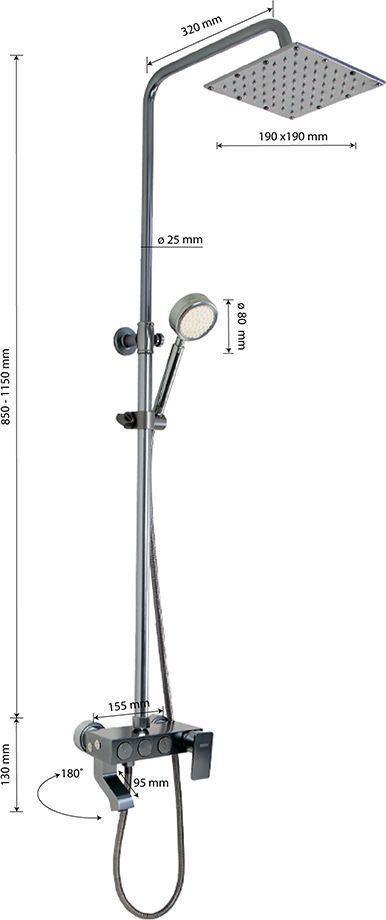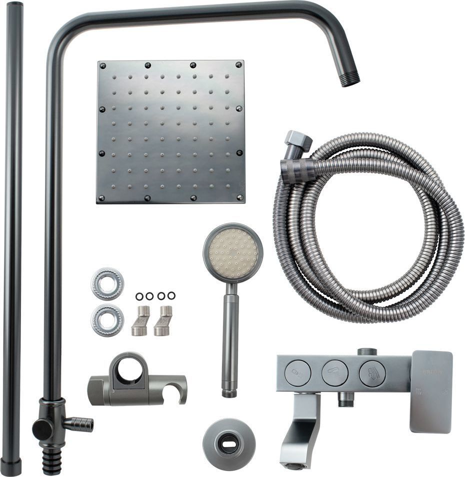 Смеситель + стойка душевая телескопическая "тропический душ" с двумя лейками в ванную / душевую комнату из авиационного алюминия цвет ТИТАН. Смеситель шаровый с кнопочным переключением режимов подачи воды на корпусе, с коротким поворотным изливом, душевым шлангом и лейкой. Картридж d = 40 мм, ручка литая, аэратор для экономии воды, чашки и эксцентрики душевая, регулируемая по высоте стойка с присоединением к корпусу смесителя и дополнительным креплением к стене и большой квадратной лейкой с эффектом тропического душа. Габаритные размеры: ширина смесителя 150 мм, высота 130 мм, длина излива корпуса 95 мм, высота телескопической стойки от 850 - 1150 мм, длина излива стойки 320 мм, душевая лейка d = 80 мм, лейка тропический душ 190 x 190 мм, шланг 150 см. Вес - 4,100 кг, объём - 0,05700 м3. В комплекте корпус с изливом, чашки, эксцентрики, прокладки, стойка, шланг, две лейки, крепления.