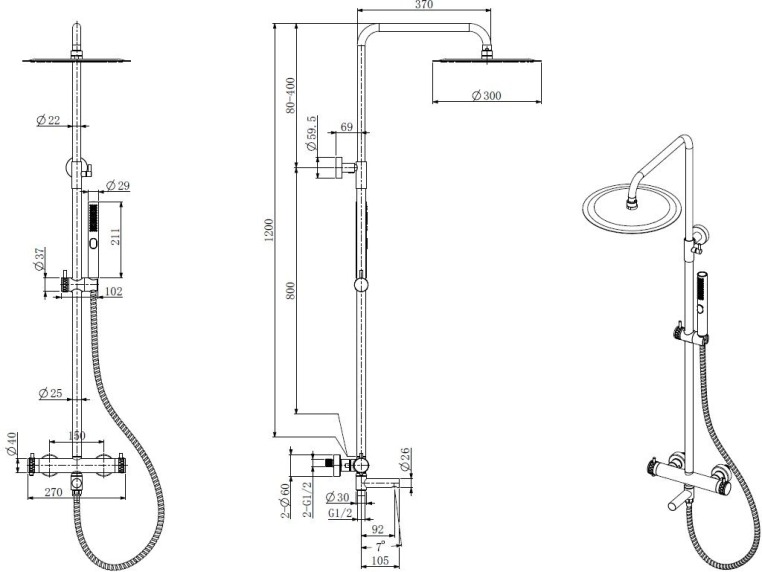 - Шланг для душа: 1,5 м шланг для душа SUS304 (EPDM inside, anti-twist, brass nut)