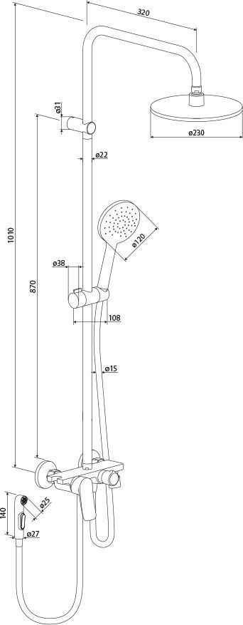 - Душевая система оснащена: смесителем-полочка для хранения средств, многорежимный поворотный излив, гигиенический душ, а также ручной душ и верхний тропический душ – целый комплекс для комфортного spa-ухода. Увеличенные душевые лейки позволят полностью насладиться душевыми процедурами - взбодриться утром и расслабится вечером. Длина душевой штанги составляет 1010 мм, ее можно установить на любой высоте и комфортно пользоваться душем людям любого роста.