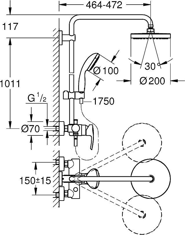 - ручной душ Tempesta 100, 2 вида струй: Rain, Jet. 9,5 л/мин, регулируется по высоте с помощью