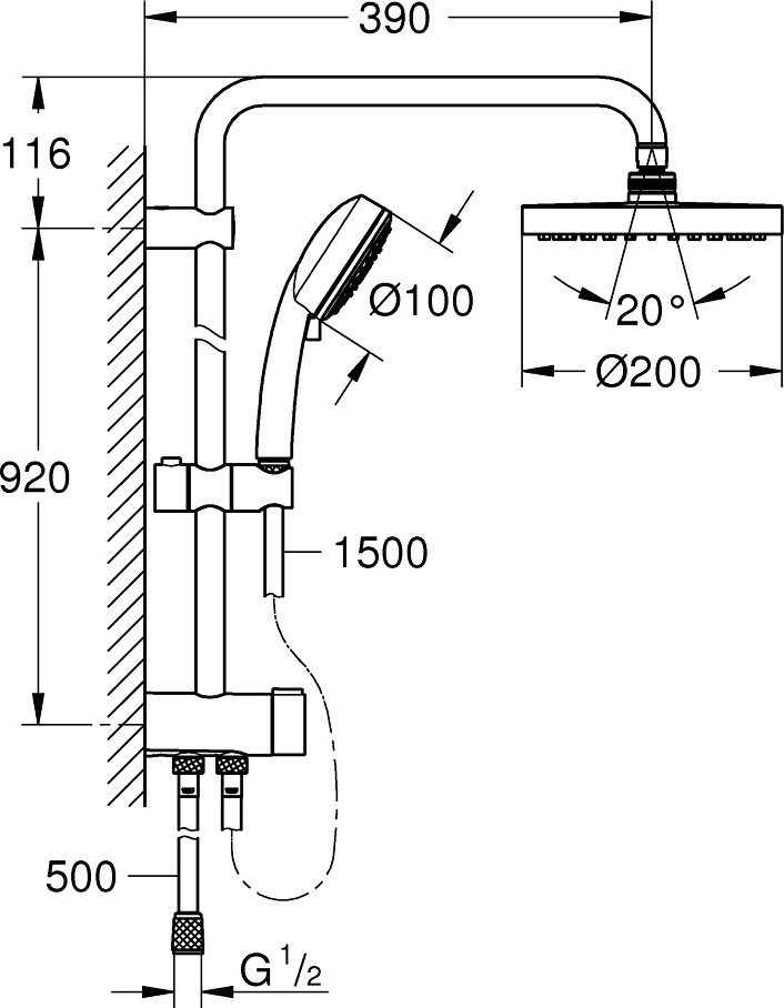 - гибкая установка: подклюяение к смесителю / подключению для душевого шланга с резьбой 1/2" душевым шлангом 500 мм